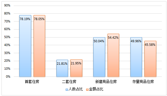 從貸款群體來看,剛需與改善型住房需求職工分別占貸款總?cè)藬?shù)的26.93%和65.56%。從單位性質(zhì)來看,以城鎮(zhèn)私營企業(yè)及其他城鎮(zhèn)企業(yè)職工為主,貸款筆數(shù)和貸款金額占比分別為51.58%、49.23%。從購房面積來看,職工貸款購買90(不含)-120㎡房屋居多,占貸款總?cè)藬?shù)的40.28%。從主借人繳存基數(shù)來看,貸款主要以中、低收入職工為主,分別占貸款總?cè)藬?shù)的27.6%、71.39%。從貸款類型來看,純公積金貸款和組合貸款占比分別為59.78%、40.22%。從貸款結(jié)構(gòu)來看,首套住房公積金貸款職工占貸款總?cè)藬?shù)的78.19%,二套住房公積金貸款人數(shù)占21.81%。具體放貸結(jié)構(gòu)如下: