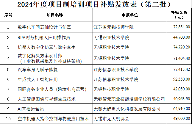 根據(jù)《市人力資源和社會(huì)保障局市財(cái)政局關(guān)于加強(qiáng)和改進(jìn)政府補(bǔ)貼性職業(yè)技能培訓(xùn)管理工作的通知》(錫人社發(fā)〔2023〕41號(hào))精神,截至目前,2024年度項(xiàng)目制培訓(xùn)已有10個(gè)項(xiàng)目完成結(jié)班,并通過(guò)第三方無(wú)錫華夏中誠(chéng)會(huì)計(jì)師事務(wù)所(普通合伙)的審核。現(xiàn)根據(jù)第三方提交的項(xiàng)目《決算審核報(bào)告》進(jìn)行補(bǔ)貼發(fā)放,發(fā)放情況如下: