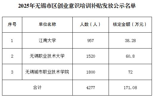 根據(jù)《關(guān)于鼓勵在錫大中專院校開展大學(xué)生創(chuàng)業(yè)意識培訓(xùn)的通知》(錫人社發(fā)〔2020〕73號)《關(guān)于發(fā)布2025年無錫市政府補貼性職業(yè)技能培訓(xùn)項目等指導(dǎo)目錄的通知》(錫人社函〔2025〕35號)文件精神,現(xiàn)將2025年創(chuàng)業(yè)意識培訓(xùn)補貼審核情況公示如下,公示期自即日起7天,如有異議,請及時以書面或口頭形式向無錫市勞動就業(yè)管理中心反映,聯(lián)系電話:0510-82829088。