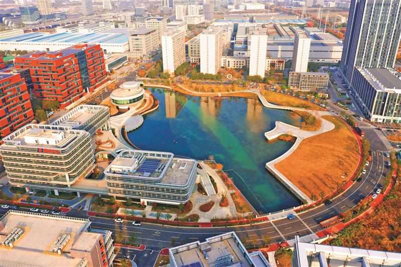 在現(xiàn)場,記者看到了一幅產業(yè)與生態(tài)相融共生的美好畫卷:產業(yè)載體的玻璃幕墻與鋼鐵交織的冷硬質感,被溫潤的湖水悄然“融化”;小三五成群在湖面上悠然“踱步”,戴勝鳥在岸邊發(fā)出“咕咕—咕咕—咕咕”的鳴唱;景觀廊道上還能看到孩子們歡快玩耍的身影……