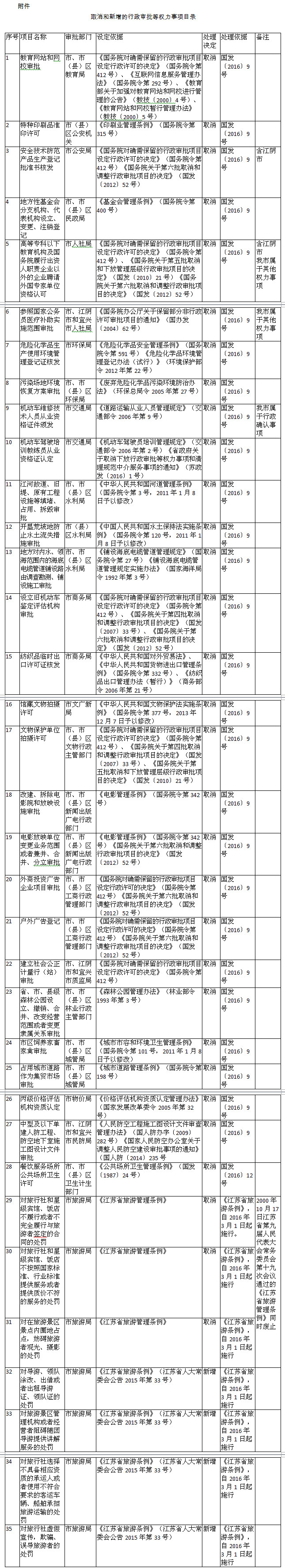根據(jù)《國(guó)務(wù)院關(guān)于第二批取消152項(xiàng)中央指定地方實(shí)施行政審批事項(xiàng)的決定》(國(guó)發(fā)〔2016〕9號(hào))、《國(guó)務(wù)院關(guān)于整合調(diào)整餐飲服務(wù)場(chǎng)所的公共場(chǎng)所衛(wèi)生許可證和食品經(jīng)營(yíng)許可證的決定》(國(guó)發(fā)〔2016〕12號(hào))和《江蘇省旅游條例》(江蘇省人大常委會(huì)公告2015年第33號(hào))等文件精神,市政府決定對(duì)應(yīng)取消28項(xiàng)行政審批事項(xiàng)、3項(xiàng)行政處罰事項(xiàng),新增4項(xiàng)行政處罰事項(xiàng)。