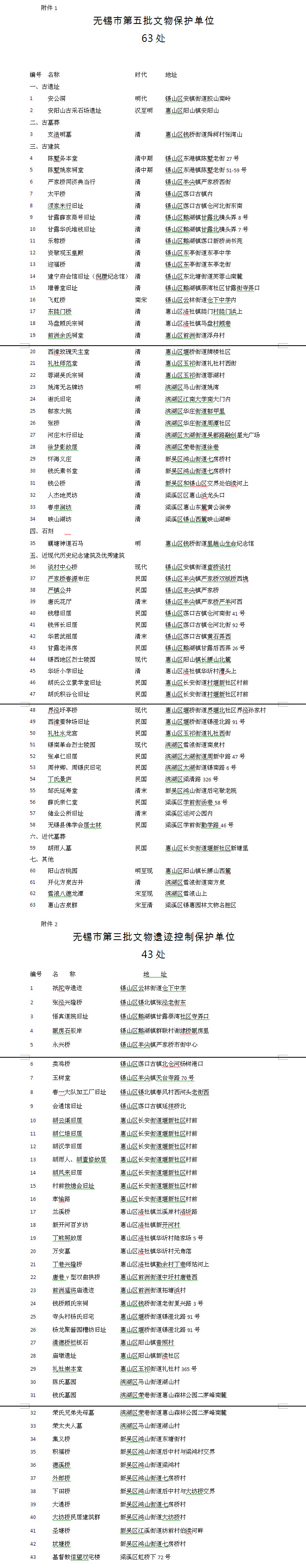 《無(wú)錫市第五批文物保護(hù)單位》(63處)《無(wú)錫市第三批文物遺跡控制保護(hù)單位》(43處)和《已公布的市級(jí)文物保護(hù)單位擴(kuò)充和更名項(xiàng)目》(3處)名單已經(jīng)市政府批準(zhǔn),現(xiàn)予公布。
