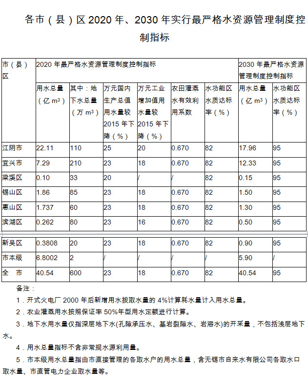 為全面落實(shí)最嚴(yán)格的水資源管理制度,深入推進(jìn)節(jié)水型社會(huì)建設(shè),根據(jù)《江蘇省用水總量控制管理辦法》(蘇水資〔2016〕37號(hào))、《省最嚴(yán)格水資源管理考核聯(lián)席會(huì)議關(guān)于下達(dá)2020年和2030年全省實(shí)行最嚴(yán)格水資源管理制度控制指標(biāo)的通知》(蘇水資聯(lián)〔2016〕5號(hào))等文件要求,結(jié)合我市實(shí)際,下達(dá)各市(縣)、區(qū)2020年和2030年實(shí)行最嚴(yán)格水資源管理制度控制指標(biāo),現(xiàn)將有關(guān)事項(xiàng)通知如下: