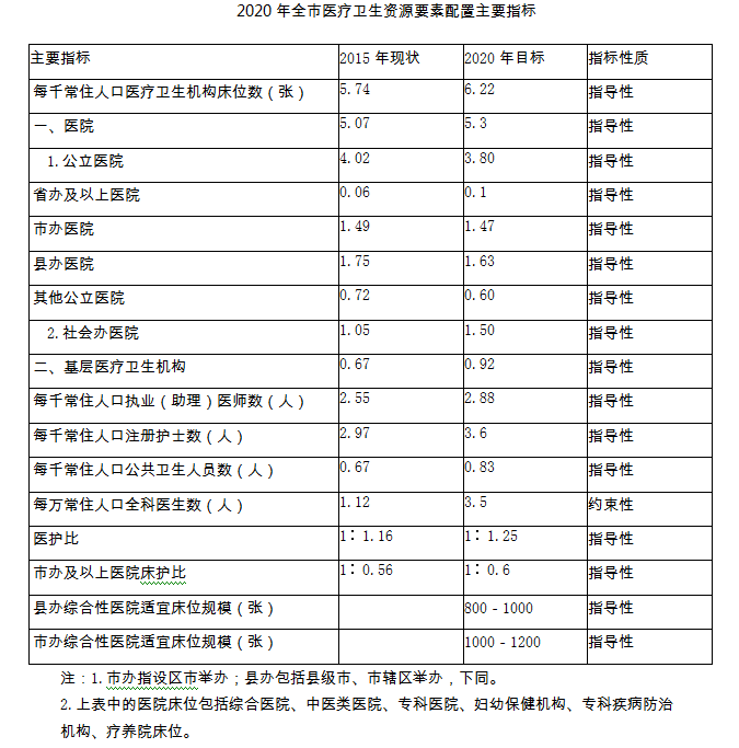 到2020年,每千常住人口醫(yī)院床位數(shù)5.3張,其中公立醫(yī)院床位數(shù)3.8張(省辦醫(yī)院0.1張,市辦醫(yī)院1.47張,縣辦醫(yī)院1.63張,其他公立醫(yī)院 0.6 張),全市按照每千常住人口不低于 1.5張為社會辦醫(yī)院預留規(guī)劃空間。