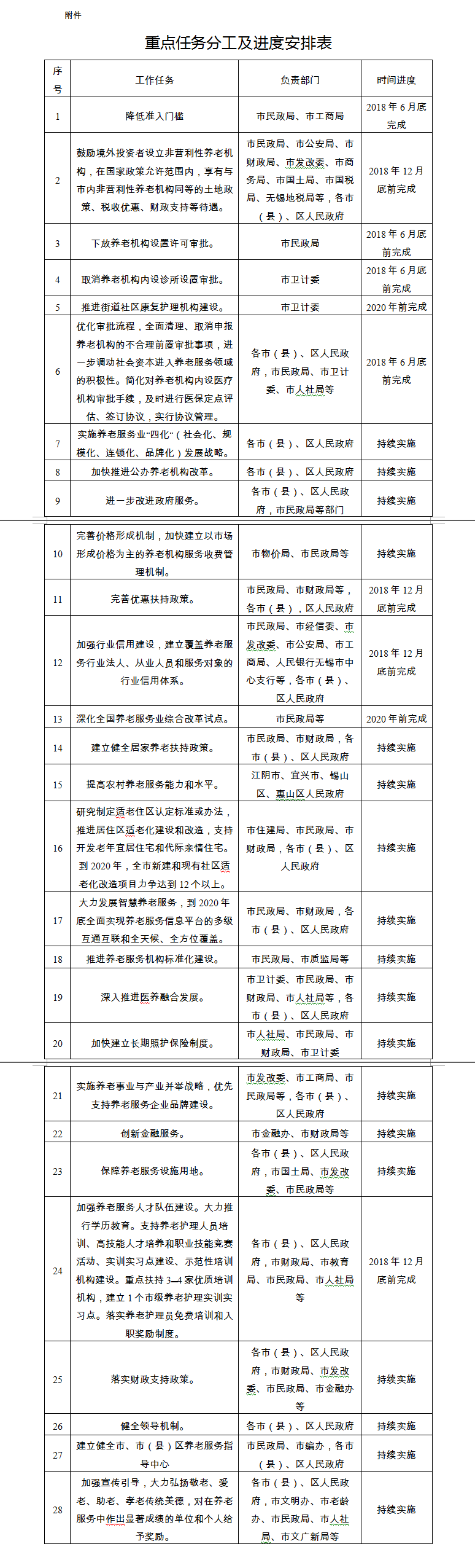 為認真貫徹落實黨的十九大精神,堅持以習近平新時代中國特色社會主義思想為指導,全面推進養(yǎng)老服務(wù)業(yè)新發(fā)展,更好地滿足我市廣大老年人日益增長的美好晚年生活需要,根據(jù)《國務(wù)院辦公廳關(guān)于全面放開養(yǎng)老服務(wù)市場提升養(yǎng)老服務(wù)質(zhì)量的若干意見》(國辦發(fā)〔2016〕91號)、《省政府關(guān)于全面放開養(yǎng)老服務(wù)市場提升養(yǎng)老服務(wù)質(zhì)量的實施意見》(蘇政發(fā)〔2017〕121號)、《省政府辦公廳關(guān)于制定和實施老年人照顧服務(wù)項目的實施意見》 (蘇政辦發(fā)〔2018〕1號)的總體部署,現(xiàn)就全面放開我市養(yǎng)老服務(wù)市場,提升養(yǎng)老服務(wù)質(zhì)量提出如下實施意見。