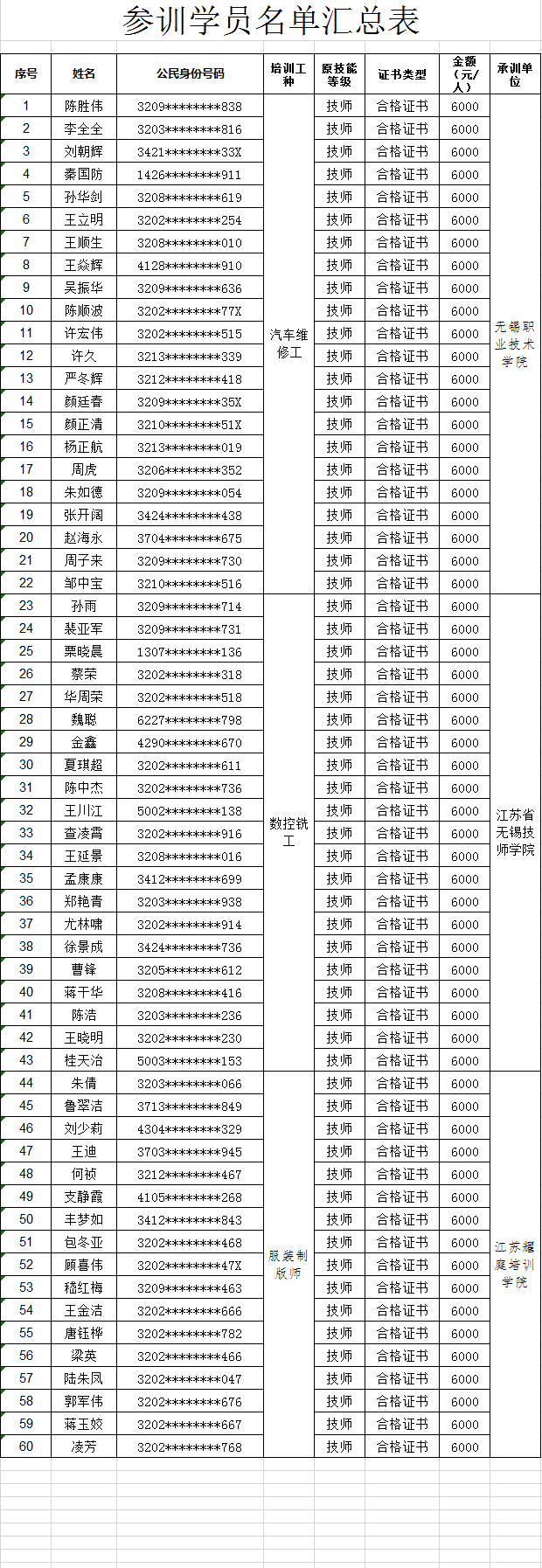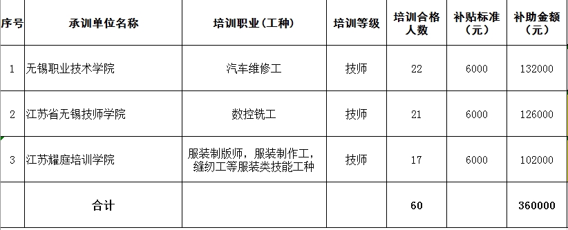 根據(jù)《關(guān)于組織開展2024年度無錫市技師崗位技能提升培訓(xùn)的通知》(錫人社函〔2024〕26號)文件精神,經(jīng)審核,3家承訓(xùn)單位符合無錫市技師崗位技能提升培訓(xùn)補(bǔ)貼條件,現(xiàn)將承訓(xùn)單位及參訓(xùn)學(xué)員名單公示如下:
