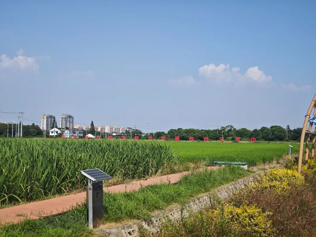 離開昊天種業(yè),代表們來到長涇鎮(zhèn)蒲市村。在蒲市大米智慧農田示范區(qū),連片的稻田里看不到忙碌的農人,取而代之的是分布在田間的傳感器和攝像頭。