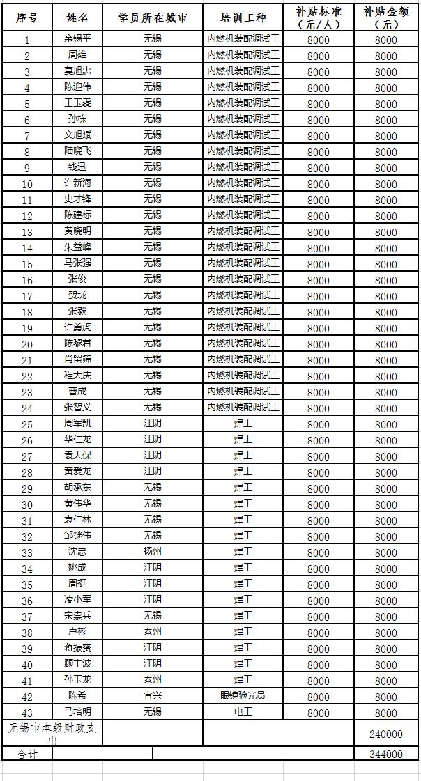 根據(jù)《省人力資源社會(huì)保障廳 省財(cái)政廳關(guān)于組織2025年度高級(jí)技師崗位技能提升培訓(xùn)的通知》(蘇人社函〔2025〕83號(hào))精神,經(jīng)審核,共有43人符合高級(jí)技師崗位技能提升培訓(xùn)補(bǔ)貼條件,其中無(wú)錫市本級(jí)30人,江陰9人,宜興1人,泰州2人,揚(yáng)州1人(無(wú)錫市本級(jí)財(cái)政補(bǔ)貼僅限于無(wú)錫市本級(jí)的30名學(xué)員)?,F(xiàn)將名單公示如下: