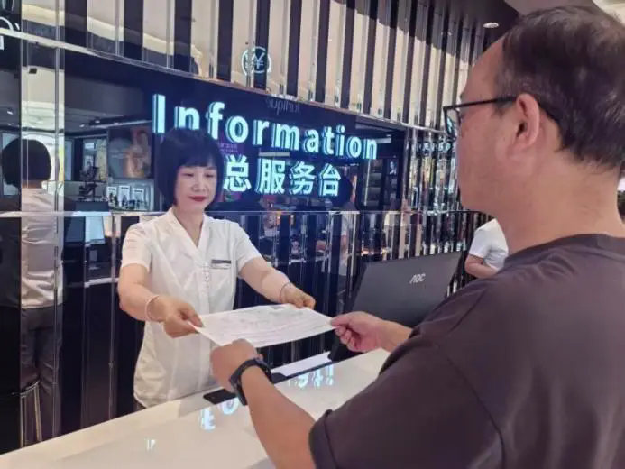 圖為無(wú)錫大東方百貨店員為出境旅客辦理離境退稅。